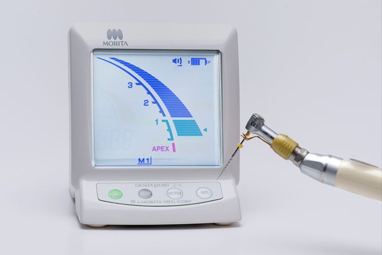 - elektrometrische Längenbestimmung: Es ist wichtig, die Wurzelkanäle in ihrer vollen Länge (aber nicht darüber hinaus) aufzubereiten. Dazu werden sie kontinuierlich während der gesamten Aufbereitung über die Bestimmung des elektrischen Widerstands ausgemessen.